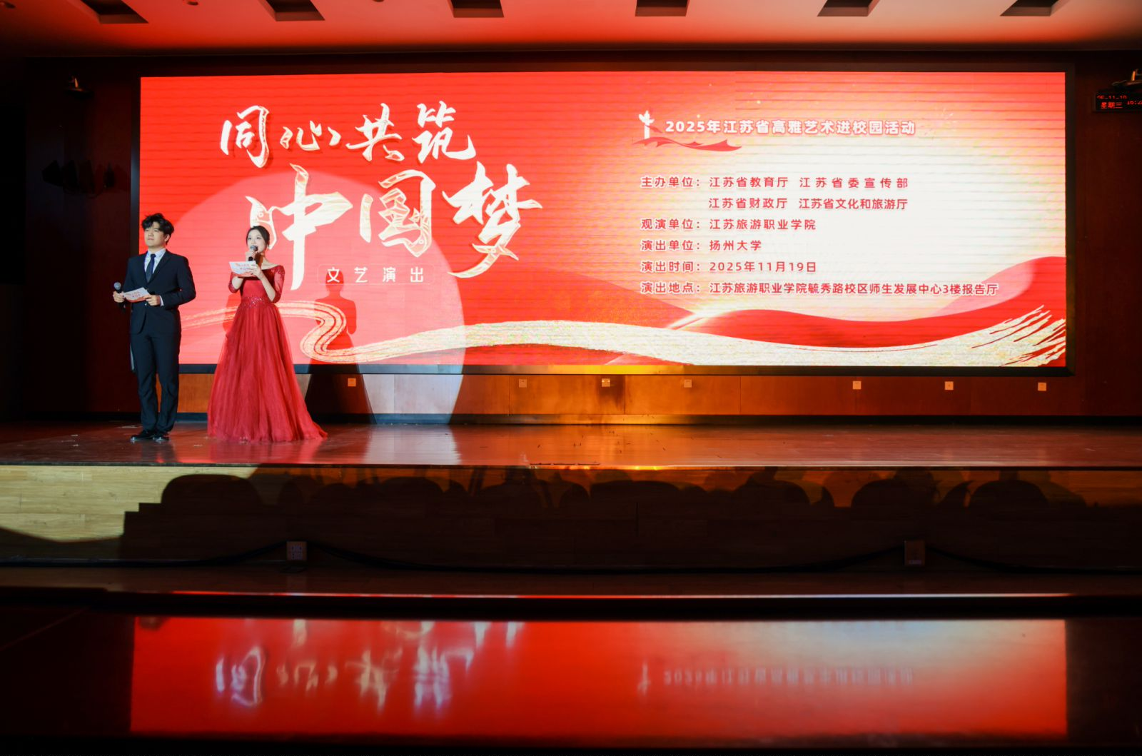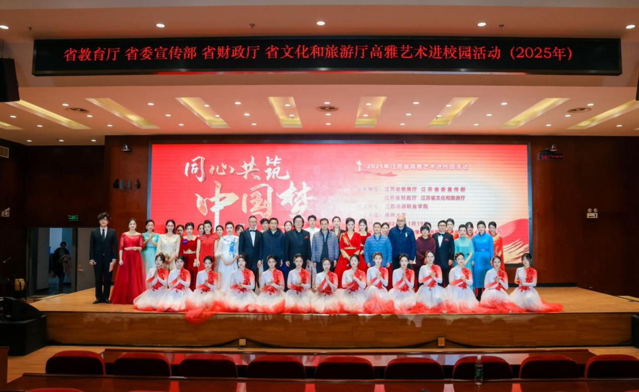 11月19日下午,由江苏省教育厅、江苏省委宣传部等部门主办,扬州大学公共艺术教育中心承办的“同心共筑中国梦”高雅艺术进校园文艺演出,在江苏旅游职业学院圆满落幕。