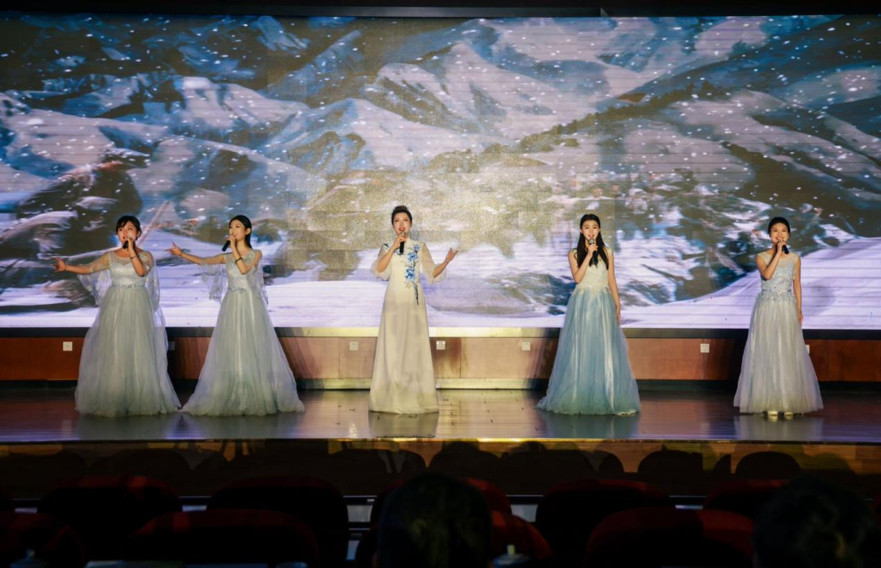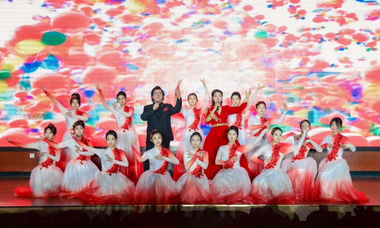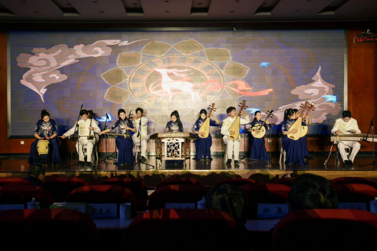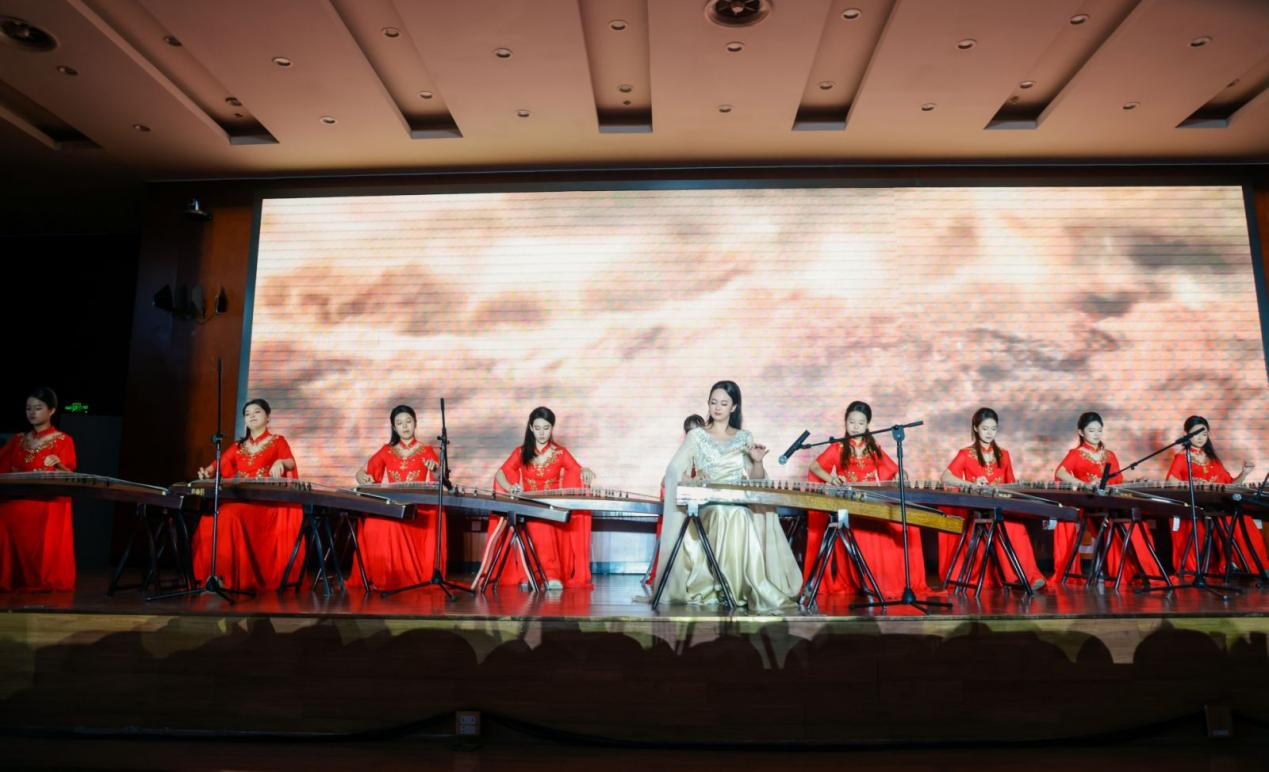 在“薪火相传·红色记忆”篇章中,琵琶与竹笛合奏《送我一支玫瑰花》以西域风情的旋律传递文化共情;表演唱《三月桃花心中开》用清甜唱腔唤醒红色年代的浪漫与赤诚;古筝重奏《黄河》则以磅礴乐声重现民族精神的壮阔史诗,让师生在传统器乐的韵律中触摸红色记忆。