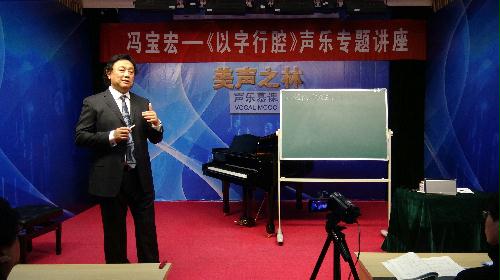 “以字行腔”是用美声唱法演唱中国歌曲的咬字发音方法。讲座从下午两点开始,整个会场座无虚席,冯宝宏先生耐心细致地讲解了关于“以字行腔”的理论知识及发声技巧,并亲自示范演唱了中国歌曲,还邀请了部分专业学生上台演唱,现场进行指导纠正,让同学们更容易掌握“以字行腔”的要点。讲座进行了三个多小时,期间高潮不断,老师及同学们一致认为:“以字行腔”方法,通俗易懂,立竿见影,为我们更好地演唱中国歌曲提供很大地帮助。