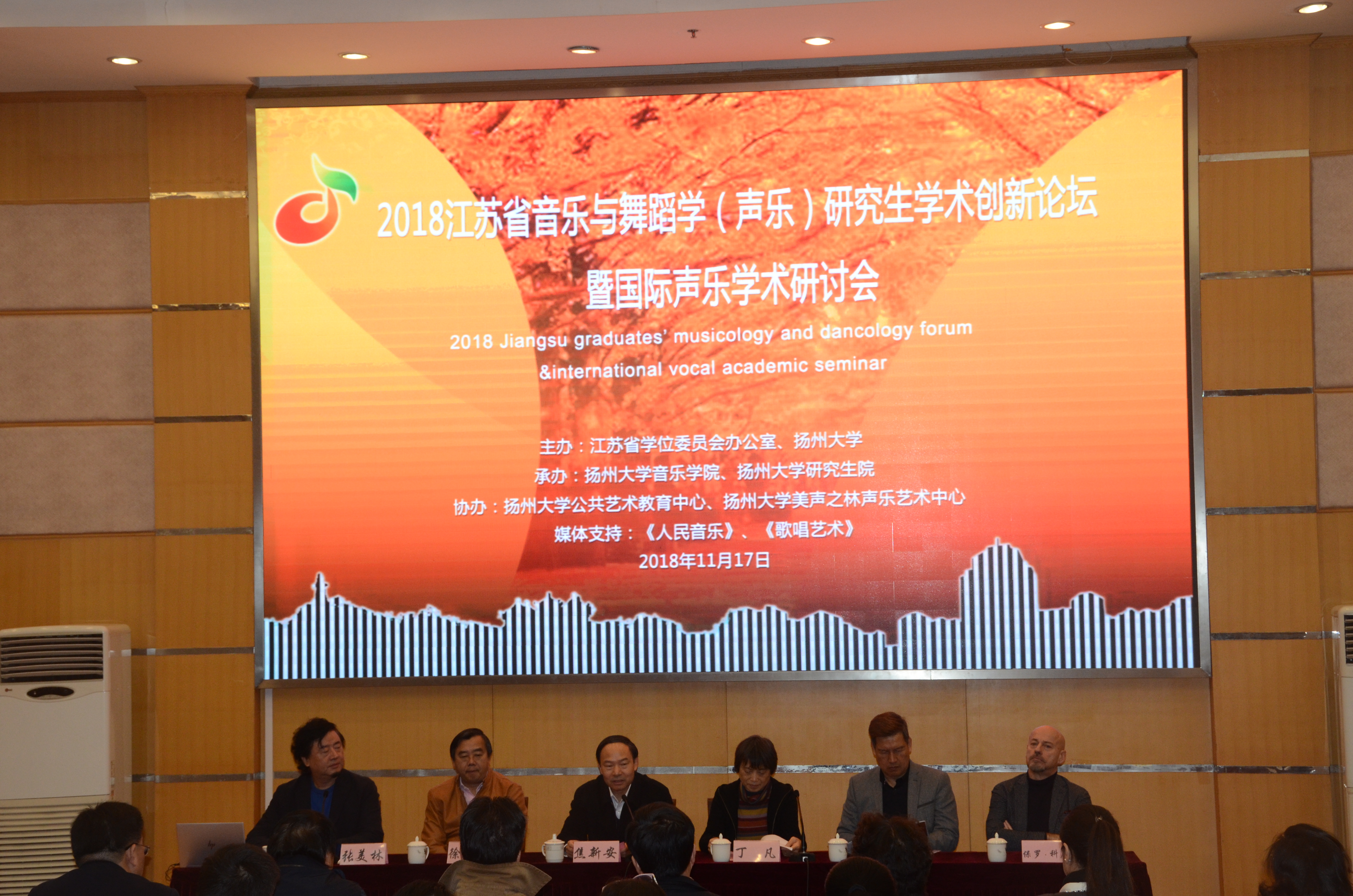 2018年11月16至19日,由江苏省学位委员会办公室和扬州大学共同主办,扬州大学音乐学院、扬州大学美声之林声乐艺术中心、扬州大学公共艺术教育中心承办的2018年江苏省音乐与舞蹈学(声乐)研究生学术创新论坛暨国际声乐学术研讨会在扬州大学荷花池校区举行。校长焦新安、全国艺术硕士教学指导委员会秘书长丁凡教授出席开幕式并致辞。扬州大学音乐学院院长张美林教授主持开幕式。国务院学位委员会音乐与舞蹈学学科评议组专家、南京师范大学音乐学院院长徐元勇教授、外聘专家意大利歌唱家保罗.科尼教授、中央音乐学院彭康亮教授、上海音乐学院于丽红教授、星海音乐学院陶英教授、南京艺术学院谢琨教授等国内音乐院校、专业艺术院校、综合性大学与师范大学音乐院系、民族高校共计265人参加了大会。