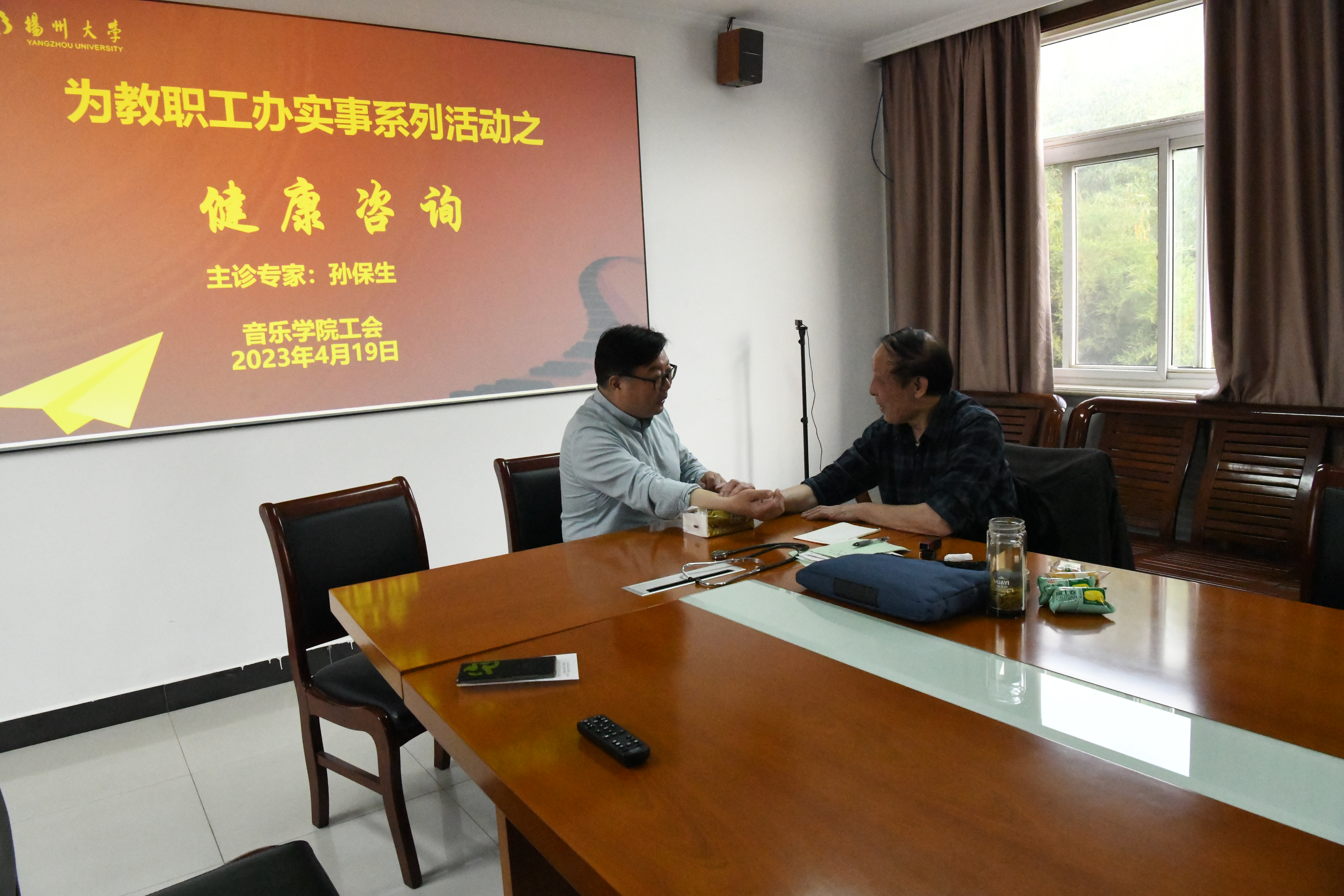 为增强教职工健康意识,提高教职工生活质量,音乐学院工会于4月19日邀请了苏北医院著名中医专家孙保生教授前来学院坐诊。
