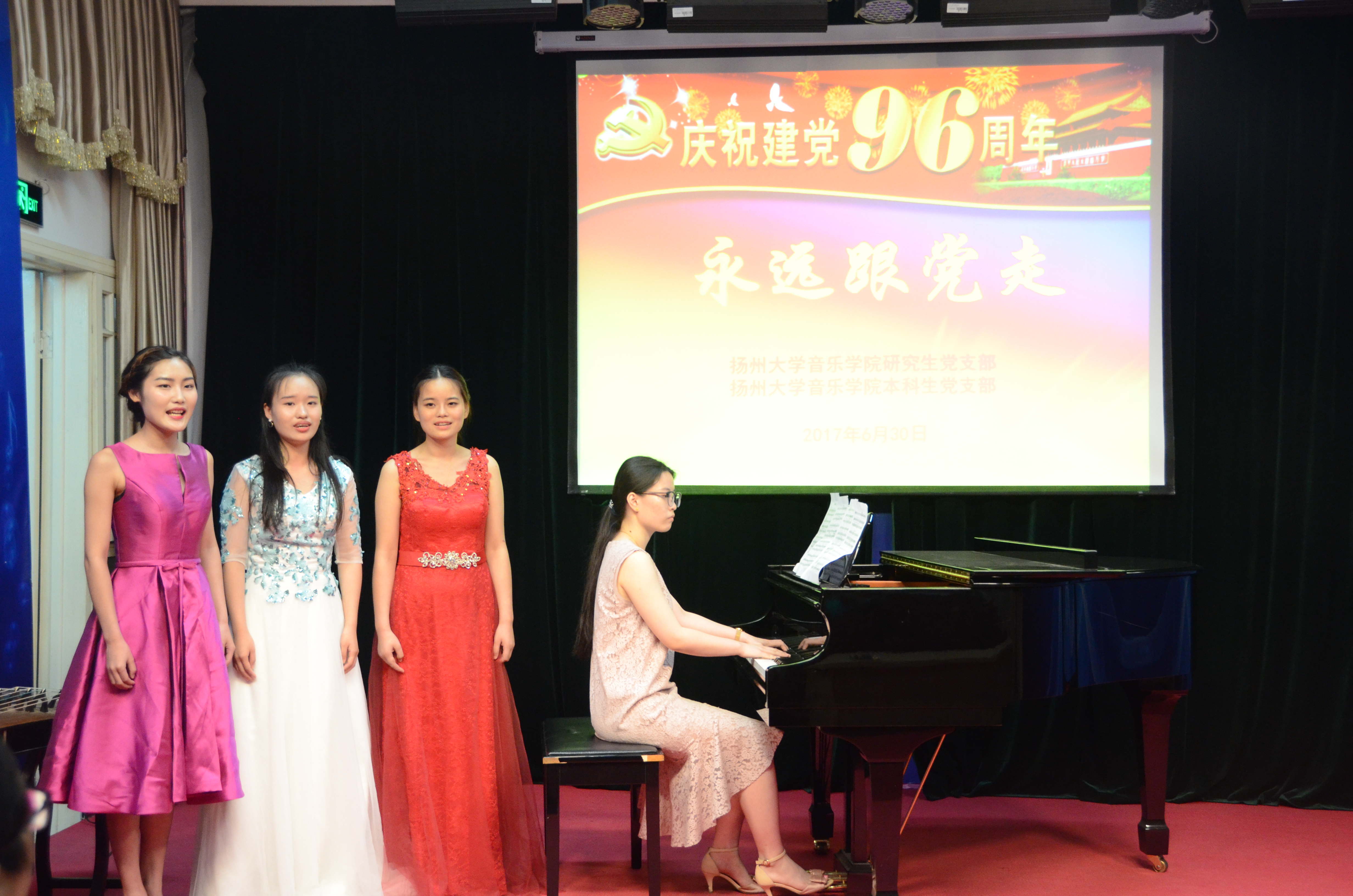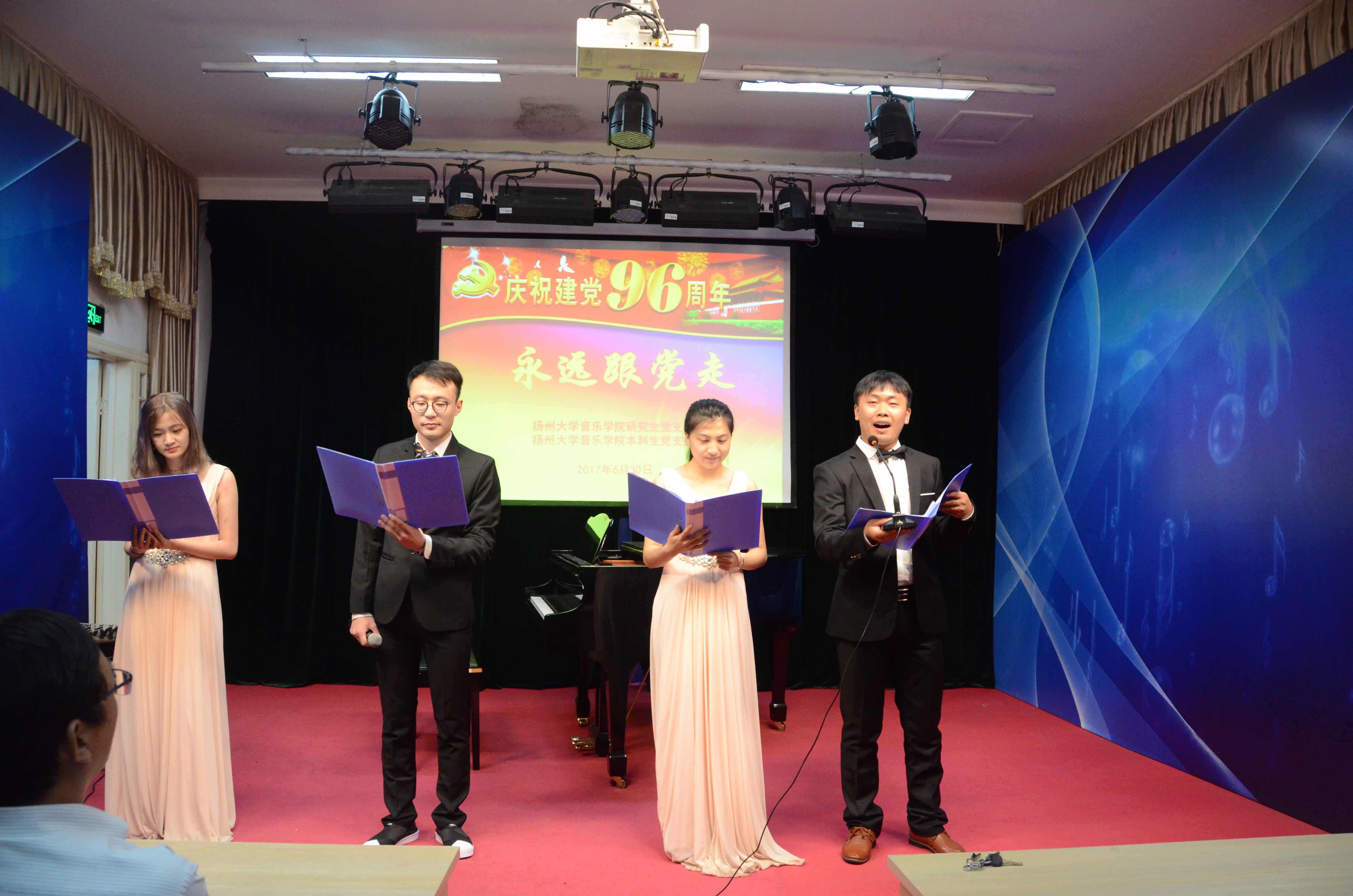 为庆祝建党96周年,重温党的非凡历程,歌颂党的光辉成就,2017年6月30日晚7:00,音乐学院研究生党支部和本科生党支部在文汇路校区鸣乐厅开展“永远跟党走”——庆祝中国共产党诞辰96周年文艺演出活动。