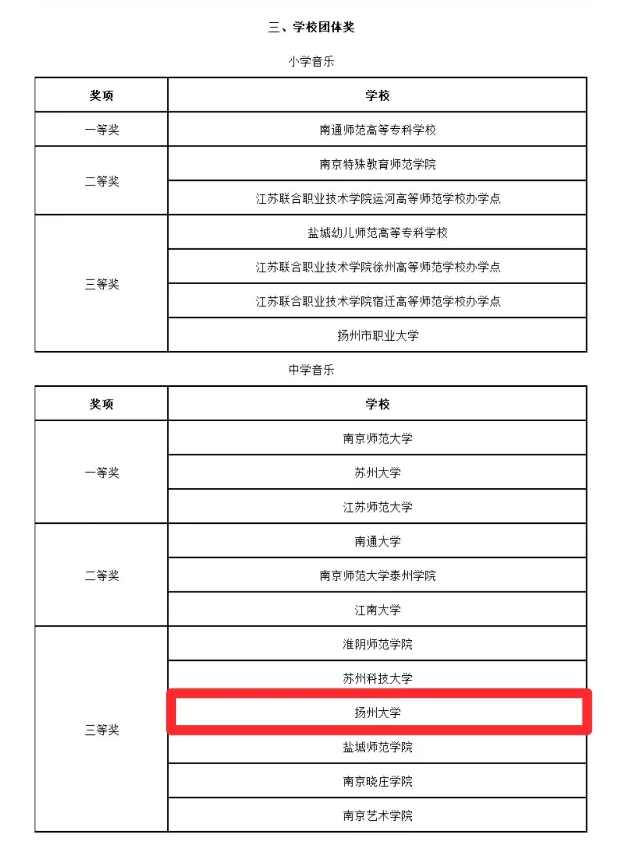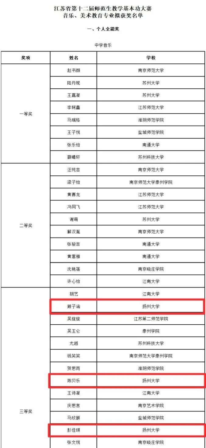 江苏省师范生教学基本功大赛是对我省高校各专业师范生人才培养质量的集中检验,是推动高校师范教育教学改革的一项重要举措。近日,由江苏省教育厅主办,江苏省学校美育教学指导委员会、江苏省高校体育教学指导委员会承办的第十二届江苏省师范生教学基本功大赛(音体美专业)获奖名单公示,我院顾子涵、陈贝乐、彭佳琪三位同学获得音乐教育专业个人全能奖三等奖;我校荣获中学音乐学校团体奖三等奖。