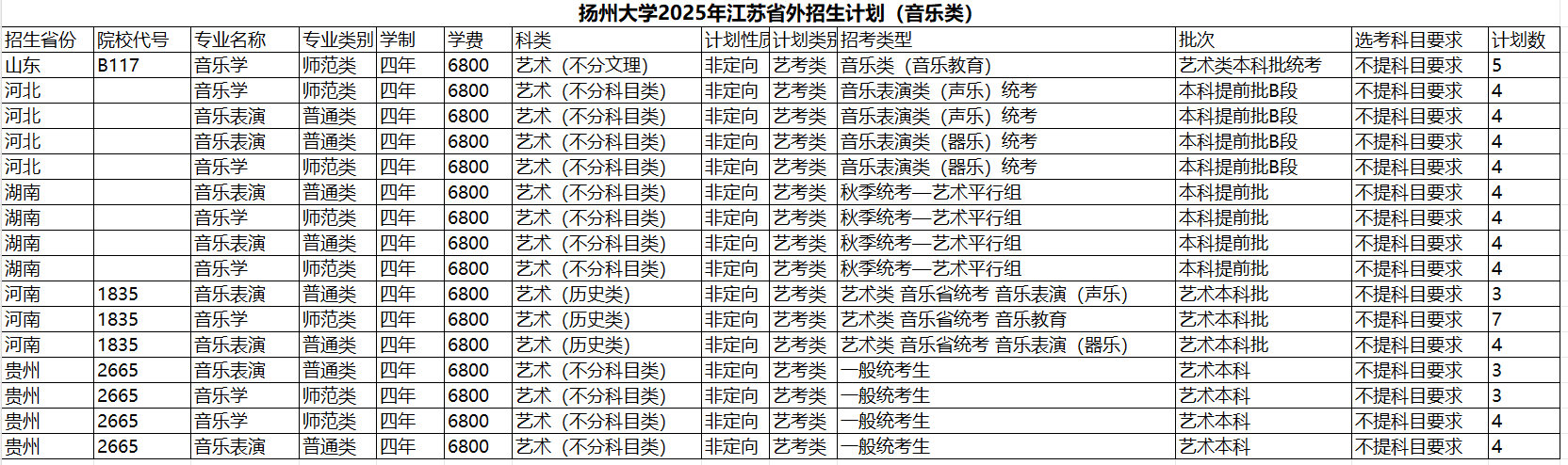 扬州大学2025年江苏省外招生计划(音乐类)